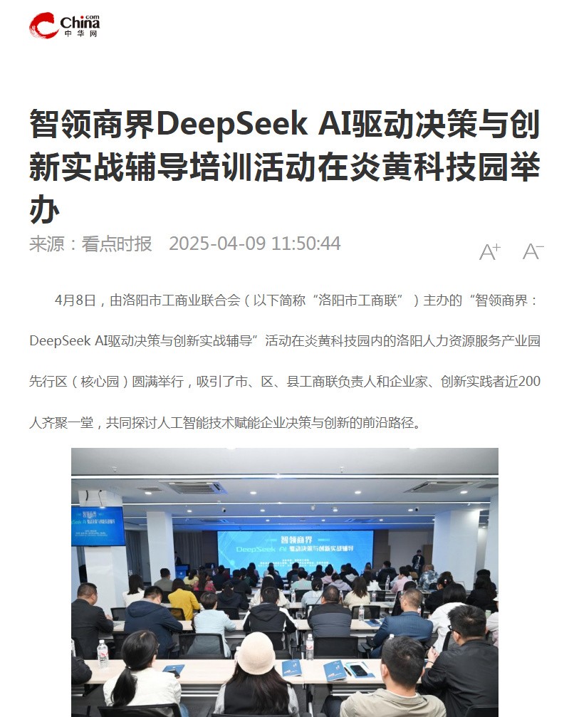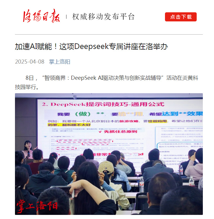 4月8日,“智領商界:DeepSeek AI驅動決策與創(chuàng)新實戰(zhàn)輔導”培訓活動在炎黃科技園舉行,轉發(fā)洛陽日報、中華網(wǎng)的相關報道——